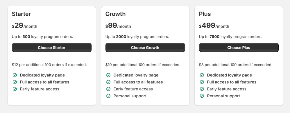 The app offers three paid plans based on monthly loyalty program orders: