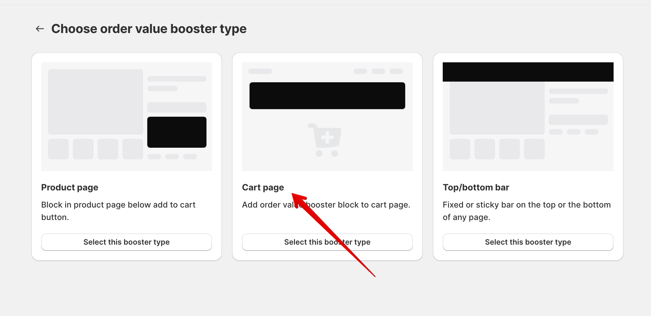 When creating a new booster in the app, select Cart page as the order value booster type, as shown below: