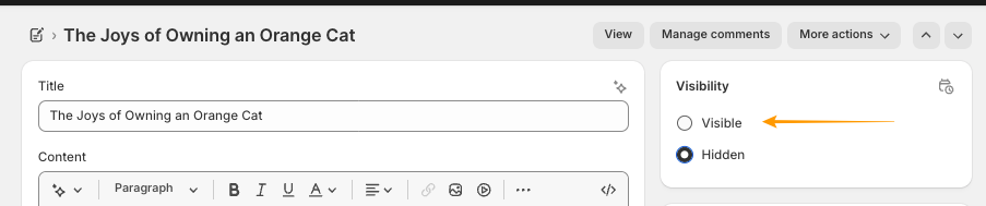In the right-hand sidebar of the Shopify editor, change the status from Hidden to Visible.
