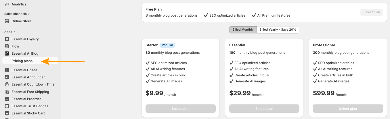Updating your plan in the Essential AI Blog Post allows you to upgrade, downgrade, or change your subscription directly through Shopify. This article explains how to manage your plan and what to do if the option isn’t available.