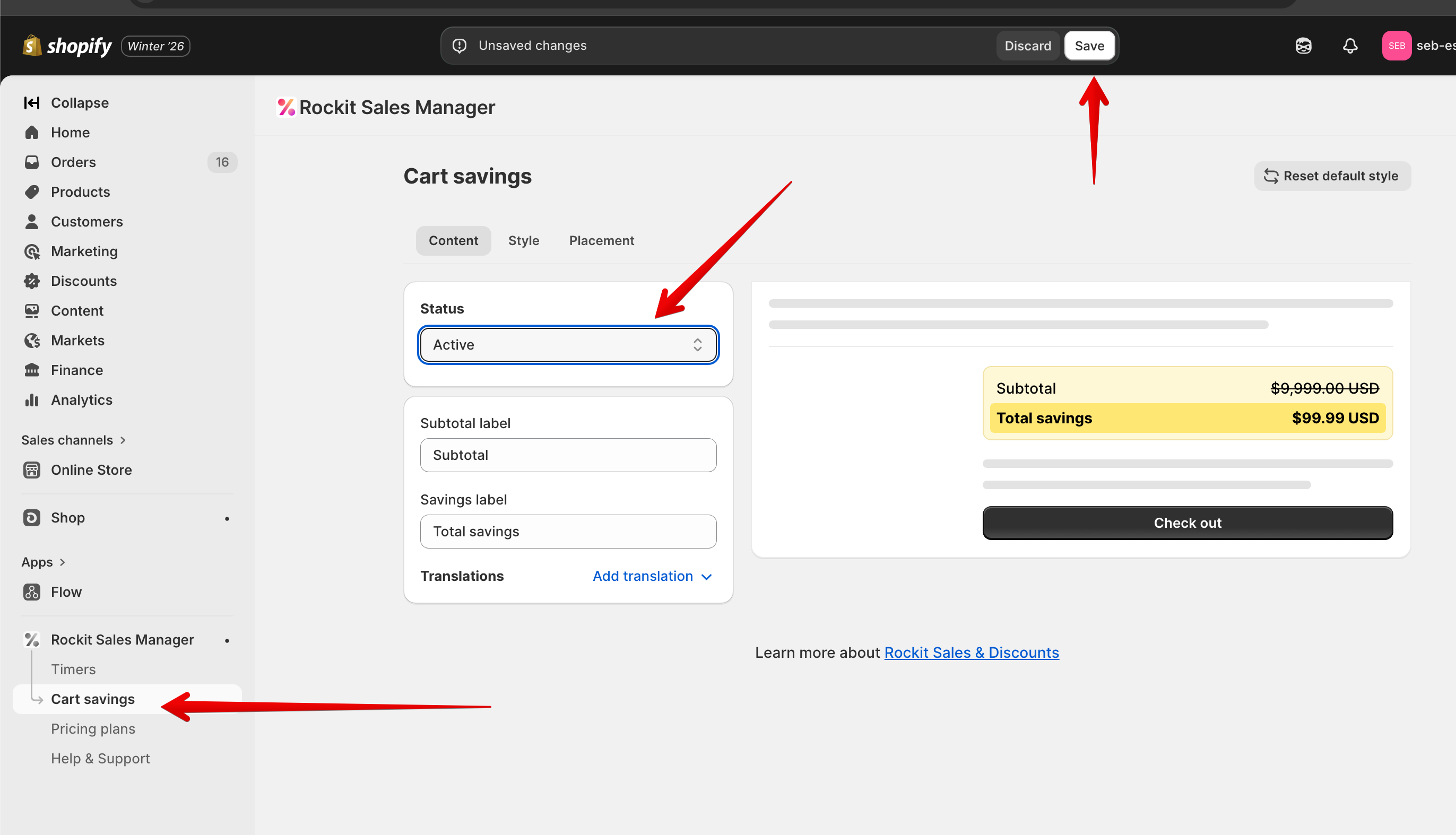 Rockit lets you show customers how much they’re saving in the cart using a built-in widget. Follow these steps to enable it: