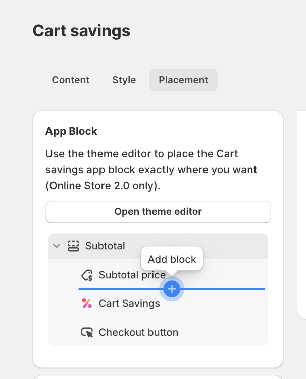 - Add the Cart Savings app block