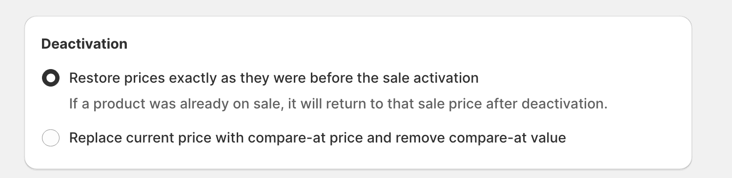 This makes it easy to control product visibility, collections, and search behavior without manual cleanup once the sale ends.