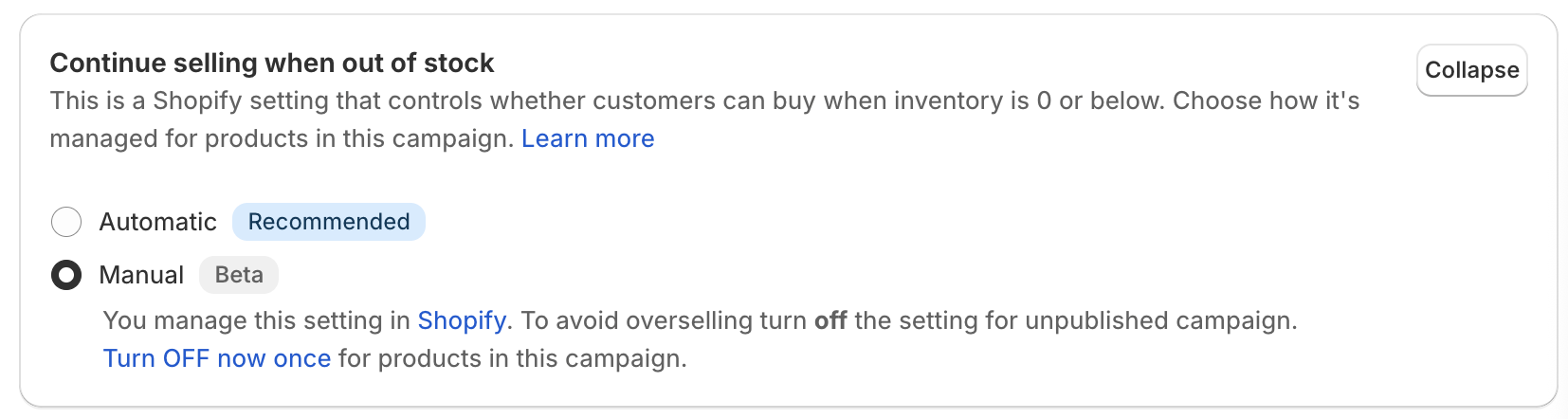 - To avoid overselling, turn off the Shopify setting for an unpublished campaign.