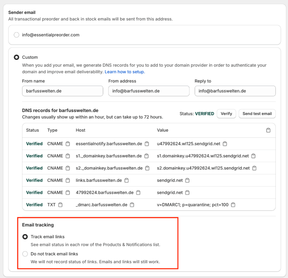 Email tracking helps you see how your preorder and back-in-stock emails perform. You can track opens (and, depending on your setup, link tracking). If your store uses a custom sending domain, tracking may route links through your domain. When your domain does not have a valid HTTPS (SSL) certificate, some customers may see a security warning when clicking links.