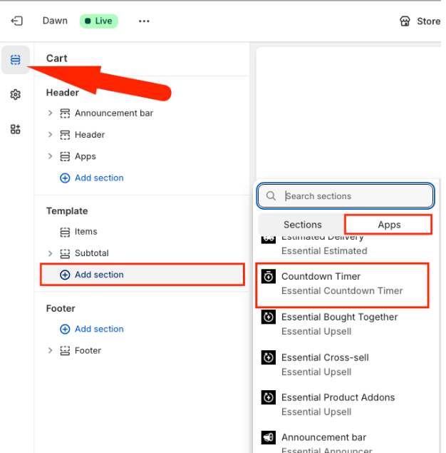 In the left sidebar, click Add section and select Essential Countdown Timer.
