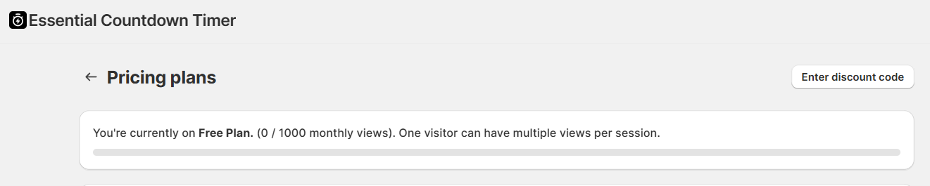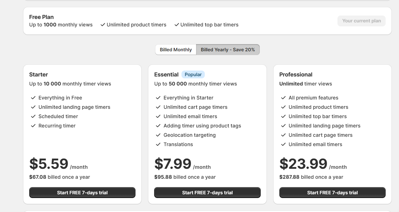 Essential Countdown Timer uses a views-based pricing model, which means your plan is based on how many times your countdown timers are shown on your store each month.