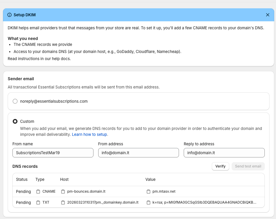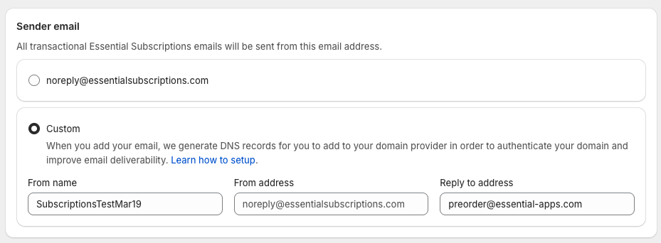 We recommend adding your own email and verifying domain to send subscription emails. This helps with email deliverability and imroves your brand continuity. Customers will see something like orders@yourstore.com instead of noreply@essentialsubscriptions.com.