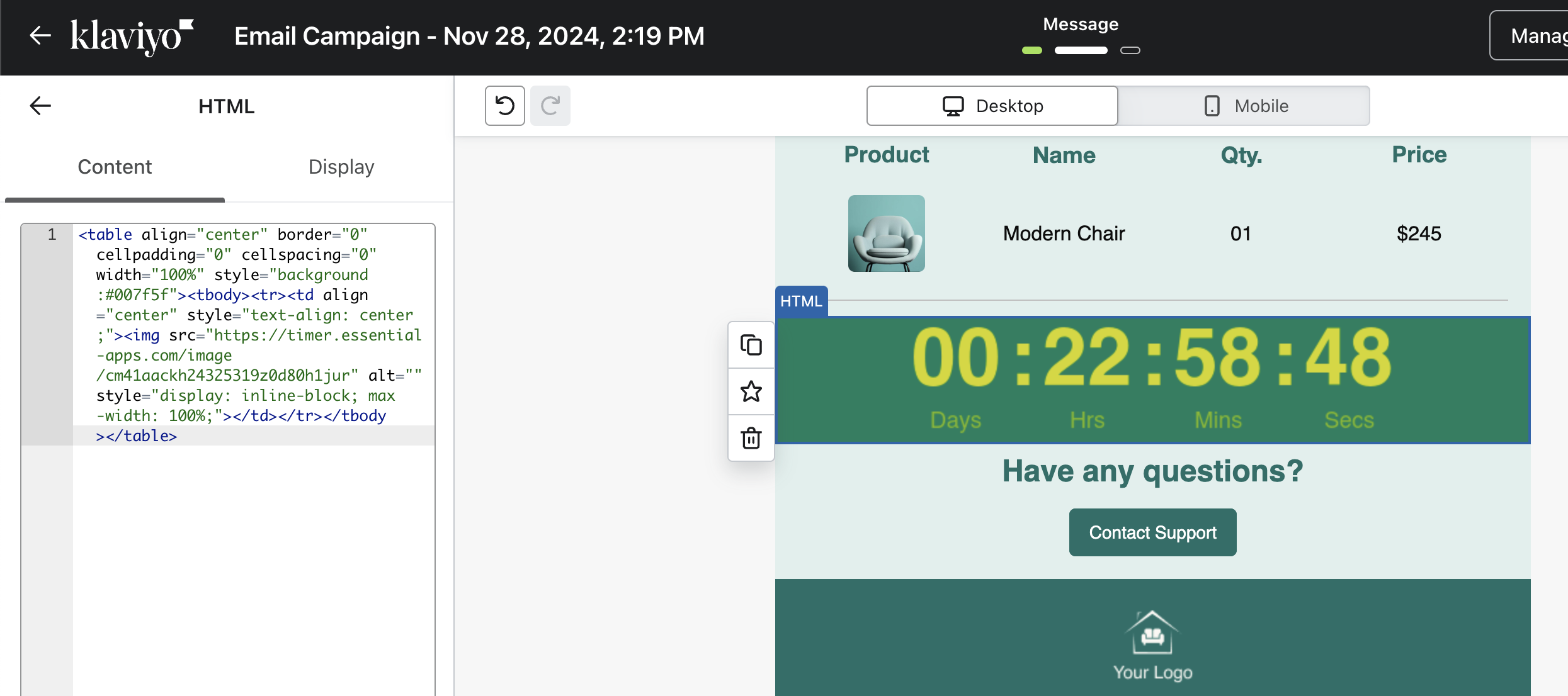 In this article, we will go through steps on how to add the Essential Countdown Email Timer inside the Klaviyo platform.