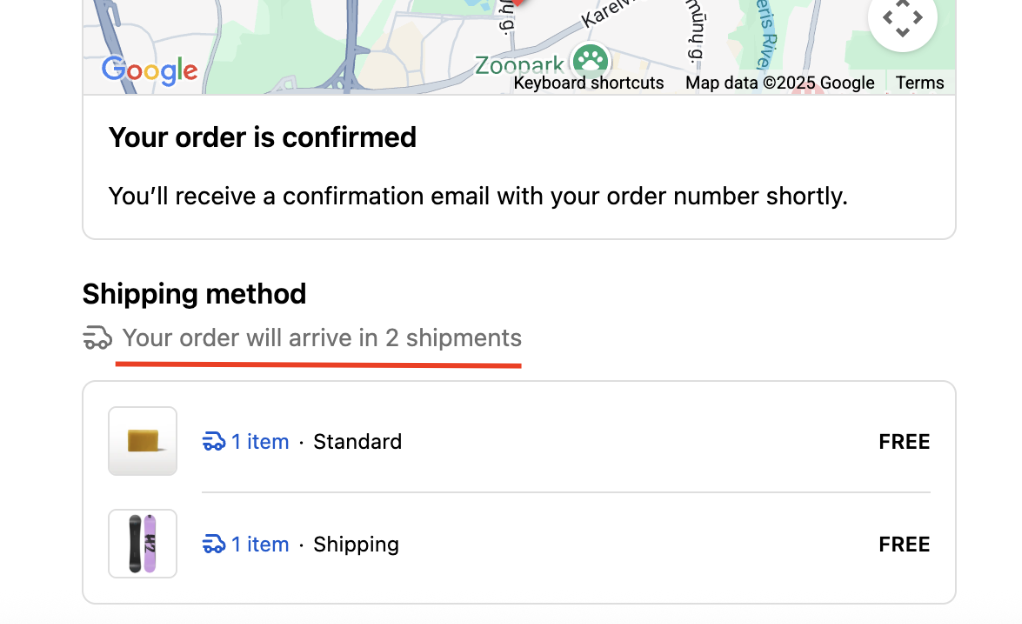 When customers accept post-purchase upsells through our application and other 3rd party upsell apps, Shopify automatically displays “Your order will arrive in 2 shipments” messaging on the order confirmation and status pages, even when all items can physically be fulfilled together from the same location. This occurs because Shopify’s core fulfillment system treats post-purchase upsells as order edits, which triggers the platform’s split shipment logic designed to handle multi-location fulfillment and inventory management. Unfortunately, this messaging cannot be suppressed or customized through app settings, Shopify admin configurations, or checkout extension APIs, as it’s controlled by Shopify’s deep platform-level order processing system.