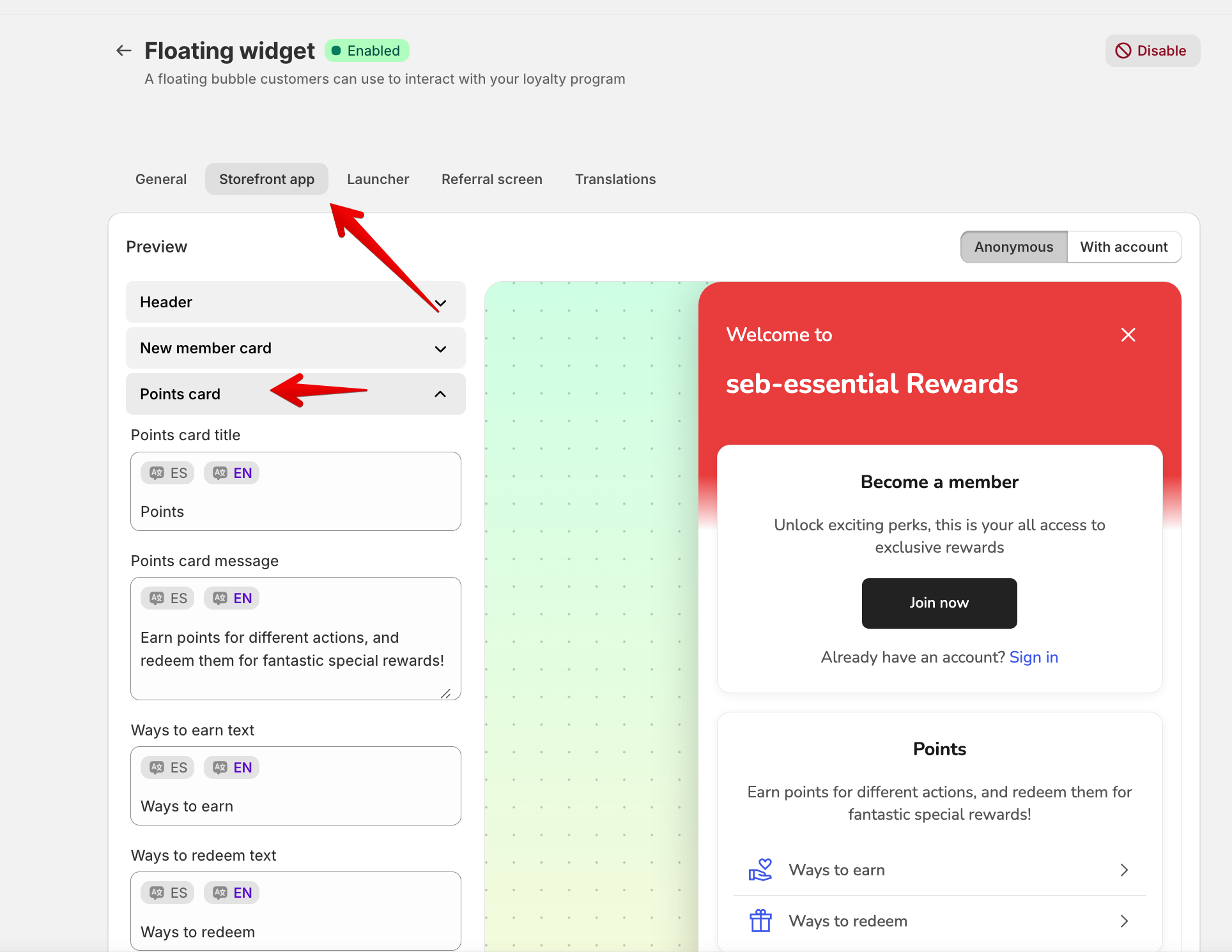 Essential Loyalty → Onsite tab → Floating widget → Storefront app